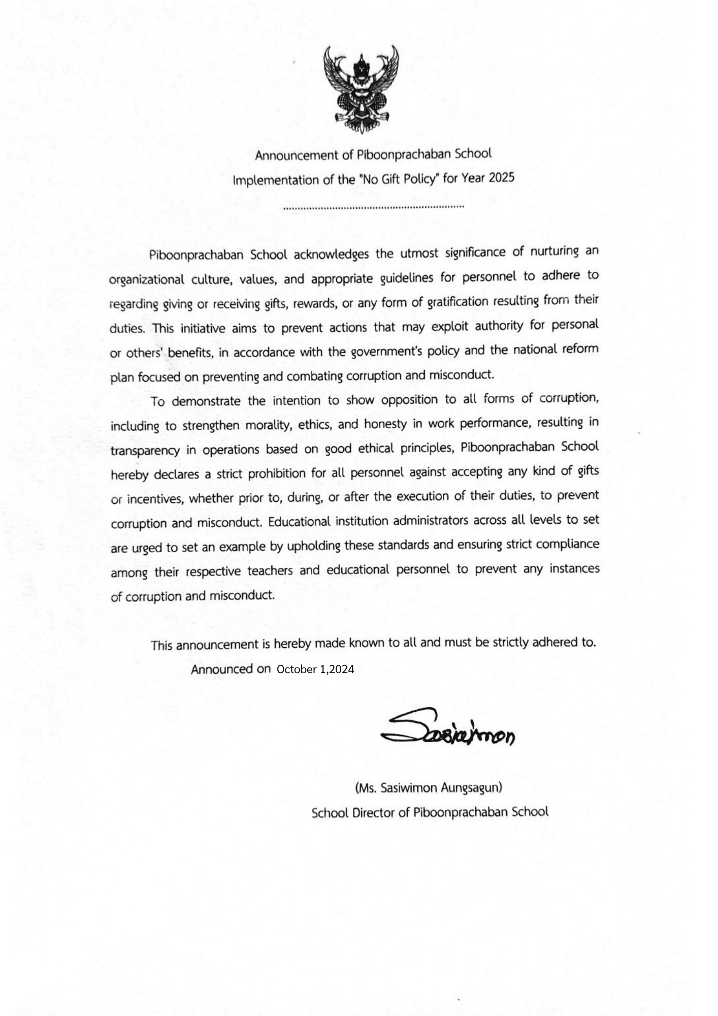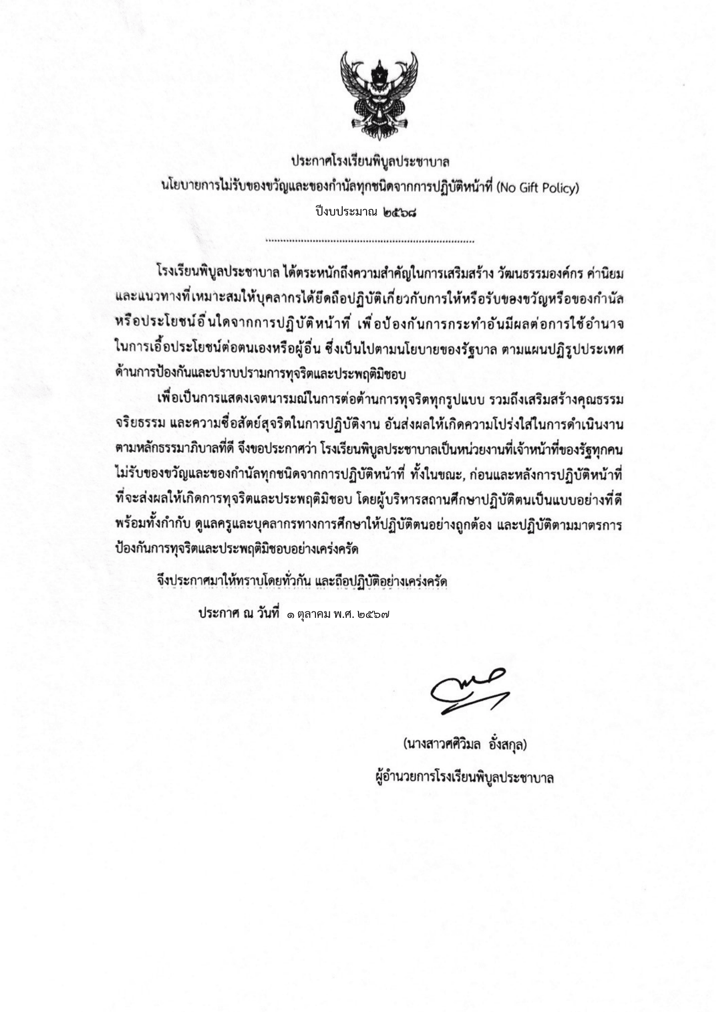 ประกาศเจตนารมณ์ ตามนโยบาย No Gift Policy จากการปฏิบัติหน้าที่